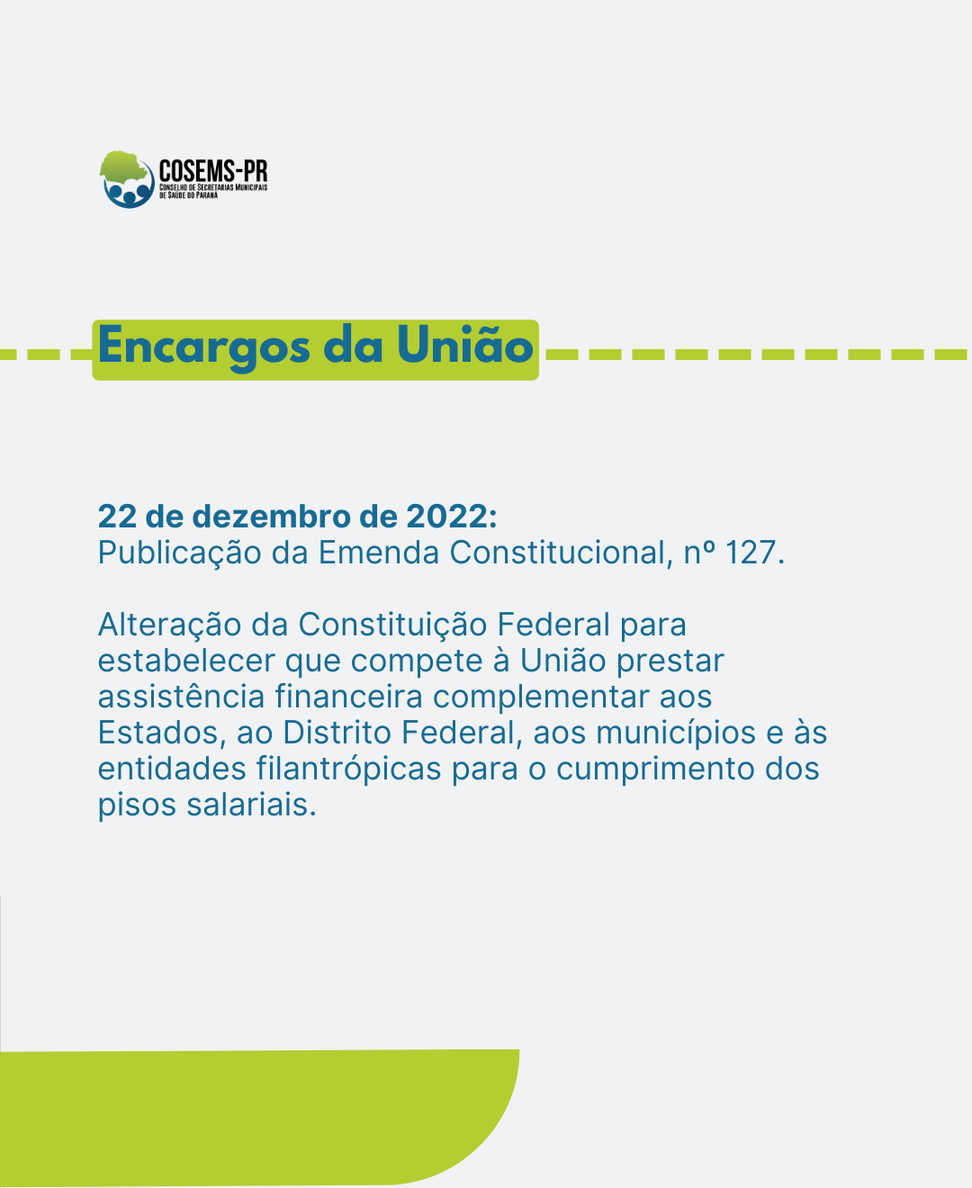 Na sequência, foi publicada a emenda constitucional, nº 127, de 22 de dezembro de 2022, com o intuito de alterar a Constituição Federal para estabelecer que compete à União prestar assistência financeira complementar aos Estados, ao Distrito Federal, aos municípios e às entidades filantrópicas para o cumprimento dos pisos salariais.