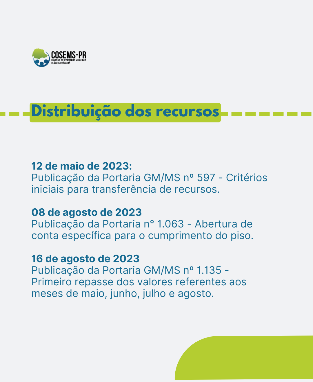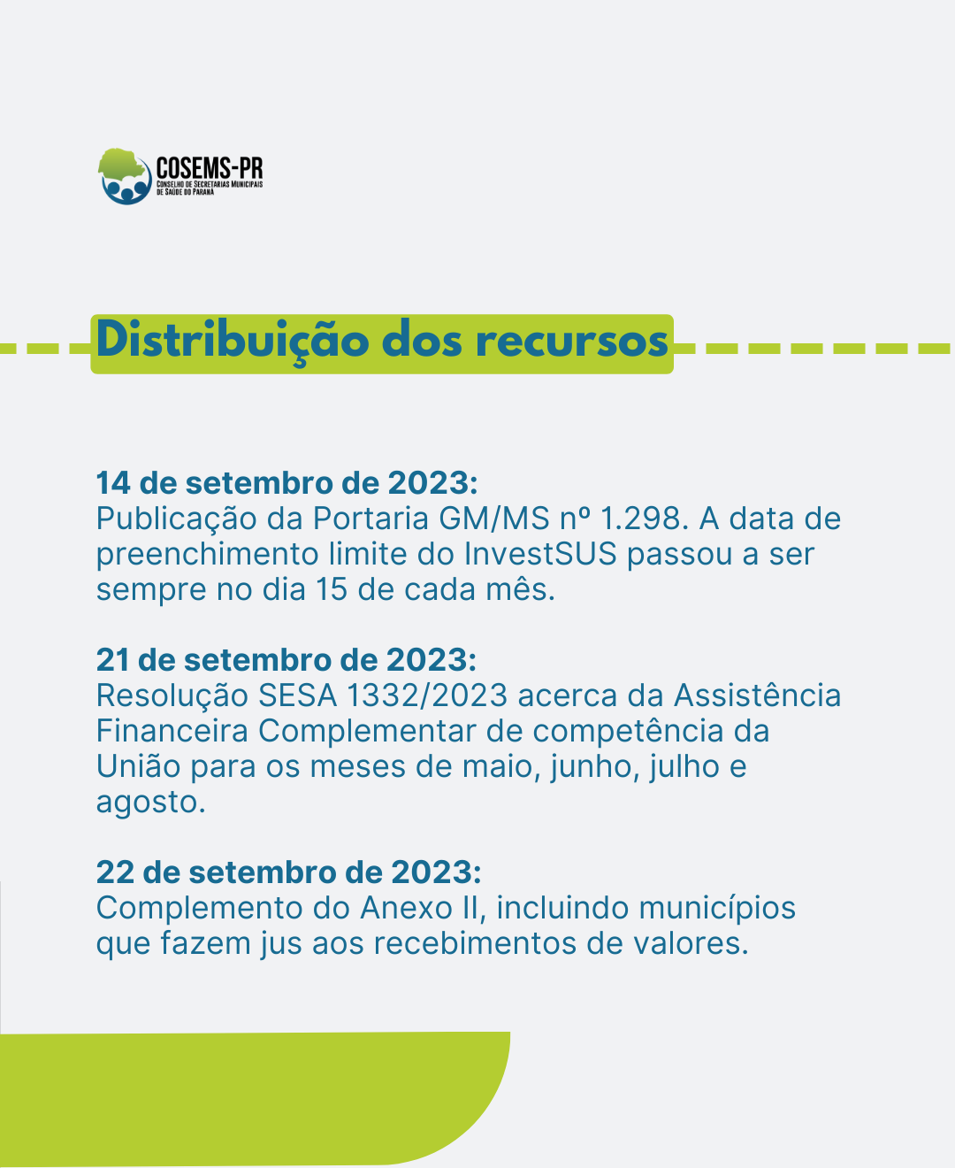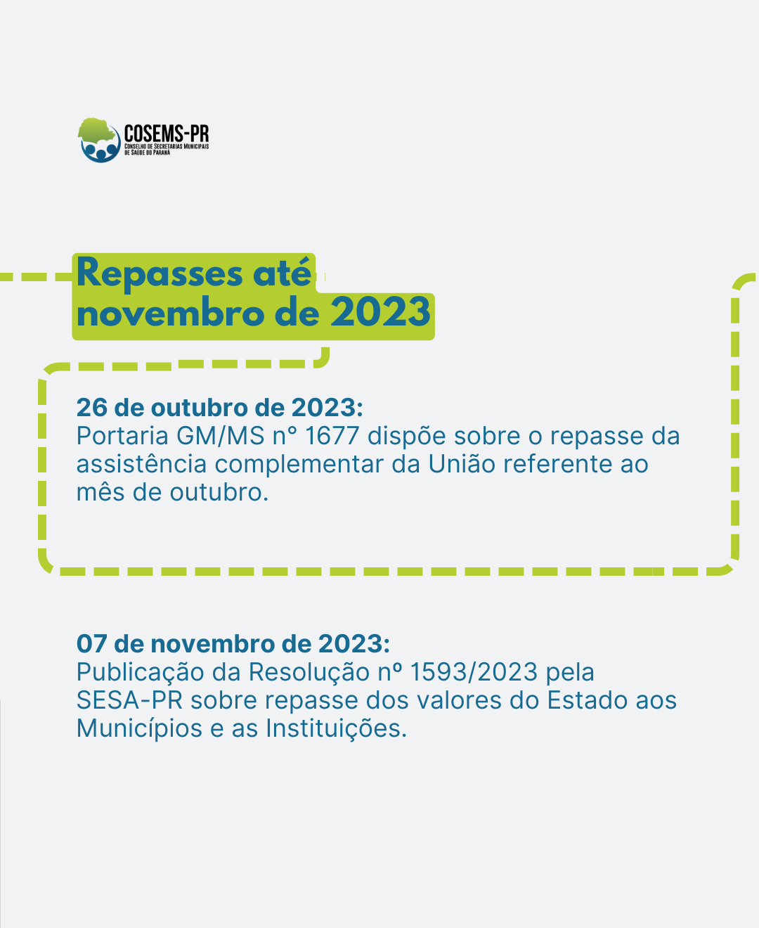 A Portaria GM/MS n° 1677 de 26 de outubro de 2023 dispôs sobre o repasse da assistência complementar da União referente ao mês de outubro. No mês de novembro, foram repassadas duas parcelas, compensando, conforme o caso, o montante a que teriam direito relativo à parcela do mês de outubro. Em 07 de novembro de 2023, a oublicação da Resolução nº 1593/2023 pela SESA-PR foi sobre o repasse dos valores do Estado aos Municípios e as Instituições.
