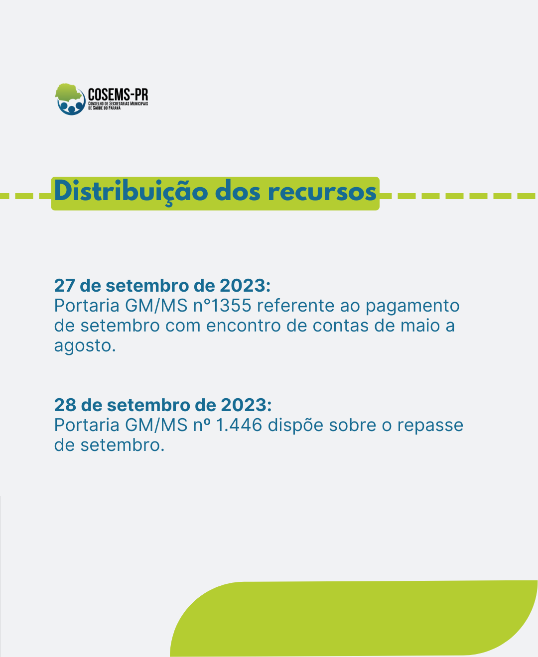Por sua vez, a Portaria GM/MS n°1355 de 27 de setembro de 2023 indicou o pagamento de contas de maio a agosto, sendo que o repasse do recurso foi realizado no dia 29/09/2023 aos Fundos responsáveis pela gestão. A Portaria GM/MS nº 1.446, de 28 de setembro de 2023 dispõe sobre o repasse de setembro.