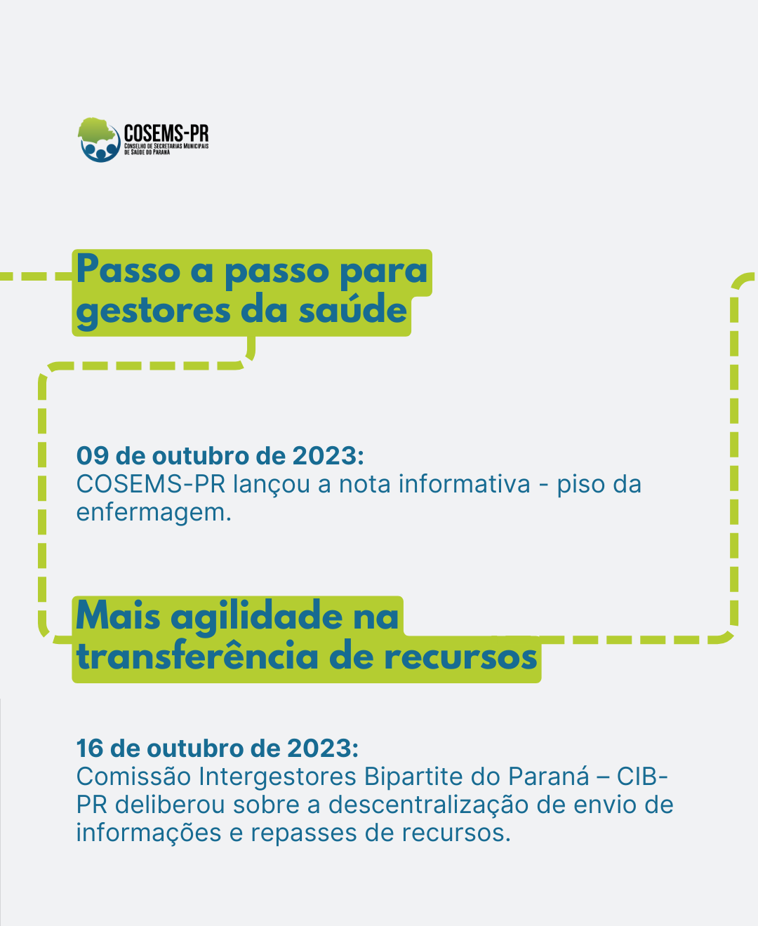 Em 16 de outubro de 2023, a Comissão Intergestores Bipartite do Paraná – CIB-PR deliberou sobre a descentralização de envio de informações e repasses de recursos. Assim, aprovou a solicitação para que o Ministério da Saúde realize o repasse federal do recurso de complemento do piso da enfermagem diretamente ao fundo municipal de saúde, referente aos estabelecimentos de saúde com natureza jurídica da Administração Pública Municipal sob gestão dupla.