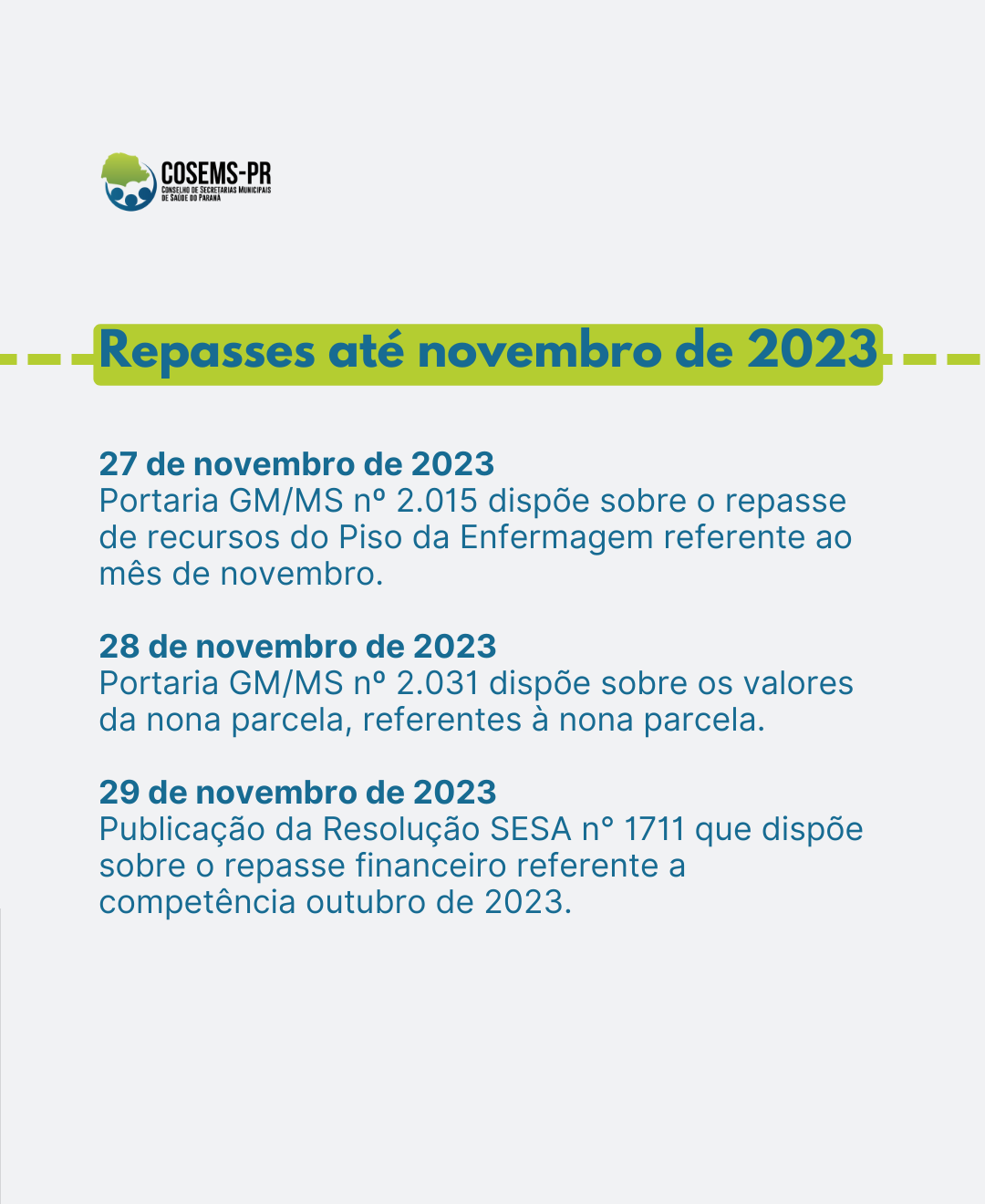 E por fim, no dia 29 de novembro de 2023, a publicação da Resolução SESA n° 1711 que dispõe sobre o repasse financeiro referente a competência outubro de 2023.